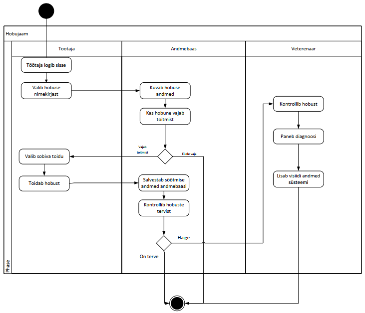 See skeem kirjeldab hobuse hooldamise protsessi talli infosüsteemis. Protsess algab sellega, et töötaja logib süsteemi sisse ja valib nimekirjast hobuse. Andmebaas kuvab hobuse andmed ning kontrollib, kas hobune vajab toitmist. Kui toitmine on vajalik, valib töötaja sobiva toidu ja toidab hobust ning söötmise andmed salvestatakse andmebaasi. Seejärel kontrollitakse hobuse tervist. Kui hobune on haige, kontrollib veterinaar hobust, paneb diagnoosi ja lisab visiidi andmed süsteemi. Kui hobune on terve, lõpeb protsess.